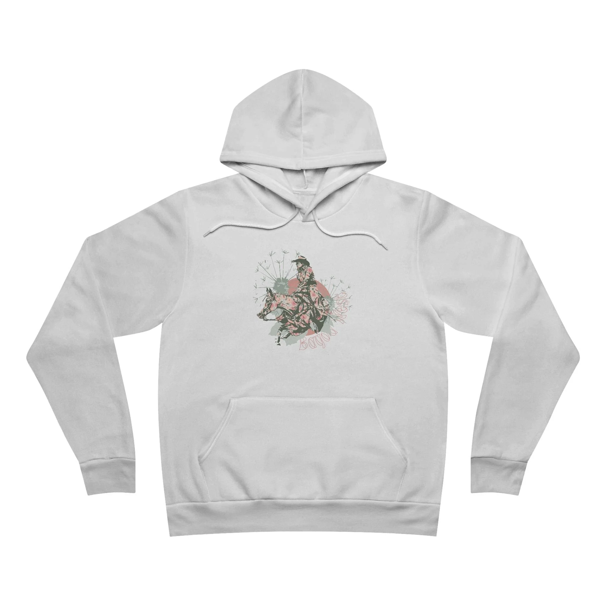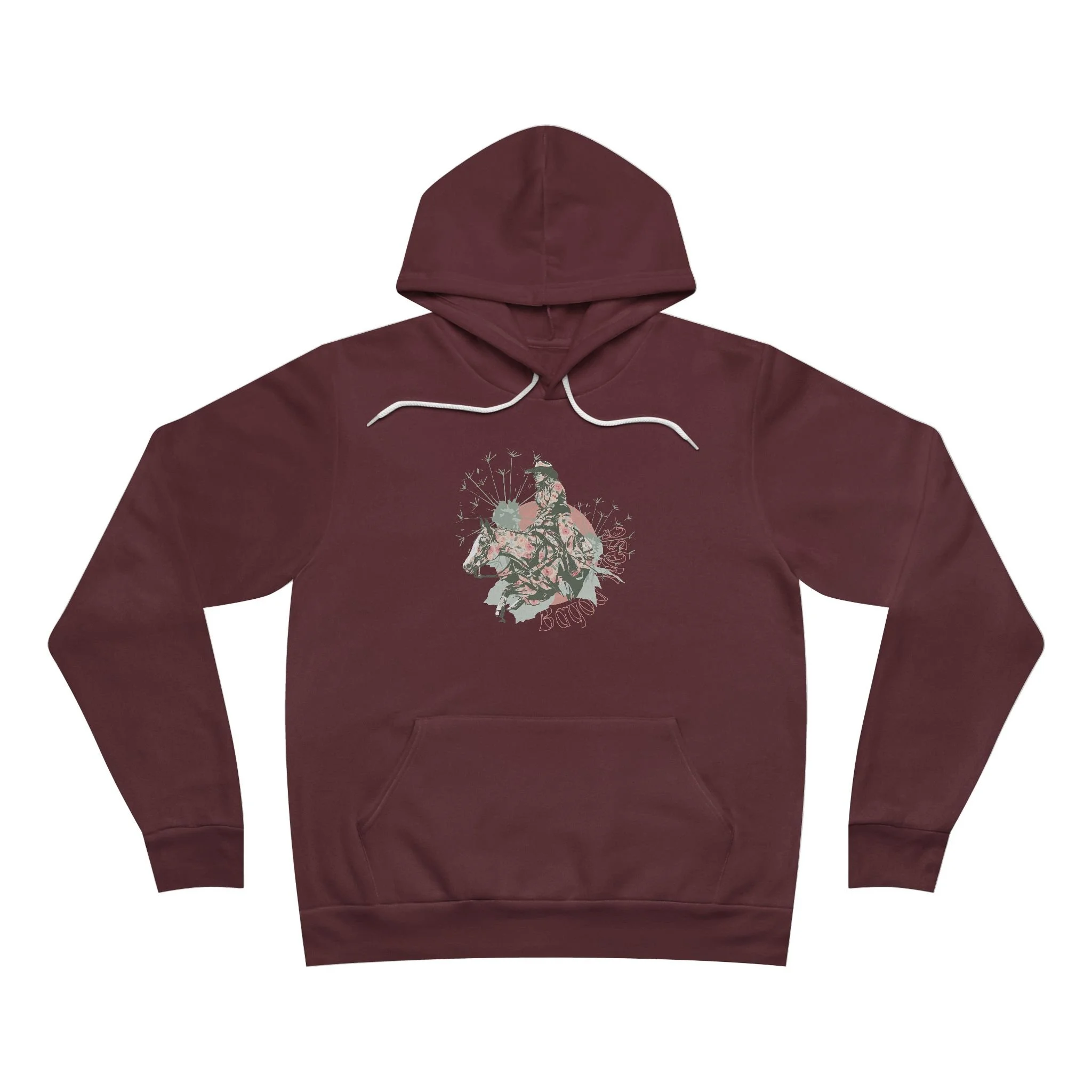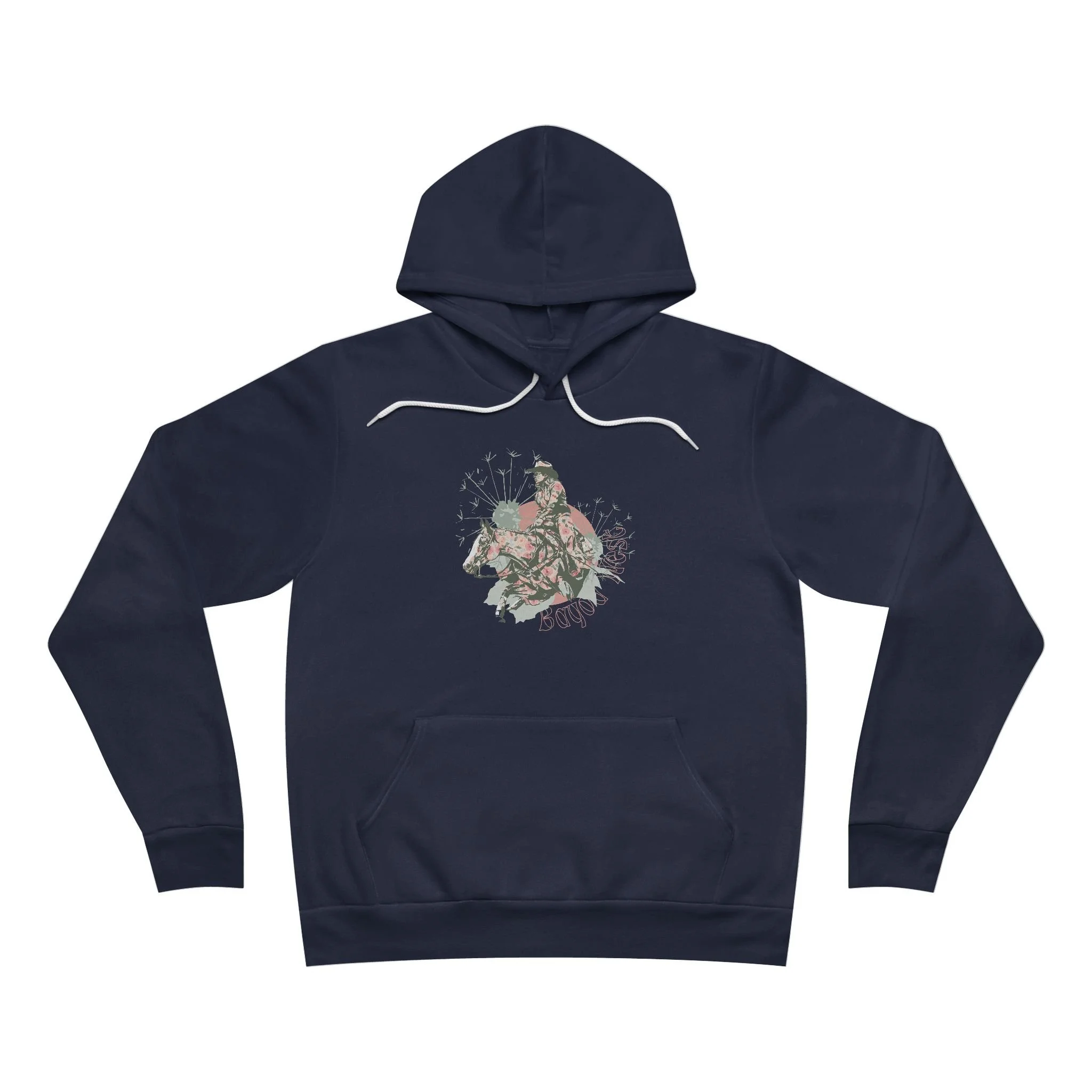 The unisex Bella & Canvas sponge fleece pullover hoodie is a blend of Airlume cotton and polyester, featuring exclusive artwork.